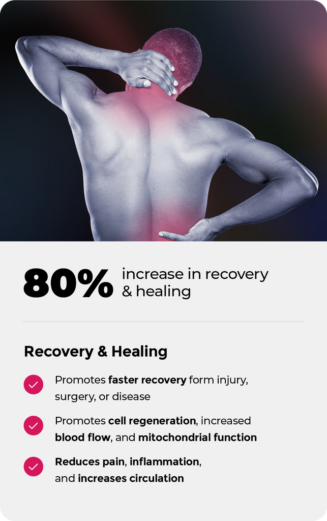 Muscle Recovery: Red Light Therapy supercharges muscle recovery by boosting ATP production, reducing inflammation, and accelerating healing with the 660, 810, 830, and 850nm wavelengths. It fights soreness, speeds up repair, and enhances performance—perfect for athletes and fitness lovers. Science-backed, non-invasive, and game-changing for peak recovery and strength.  |
