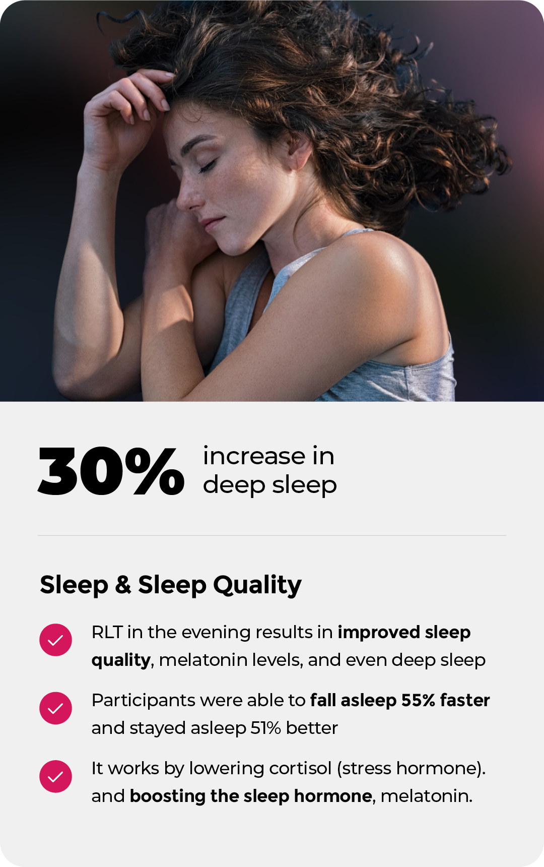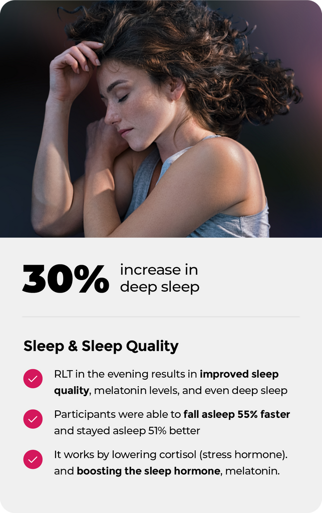 Sleep: Red & Near-Infrared Light Therapy including the 660, 810, and 850 nm wavelengths boosts melatonin, resets your circadian rhythm, and enhances deep sleep—helping you fall asleep faster and wake up refreshed. Proven to improve sleep quality in athletes and shift workers, it’s a natural, non-invasive way to optimize rest and recovery for peak performance and well-being!  |